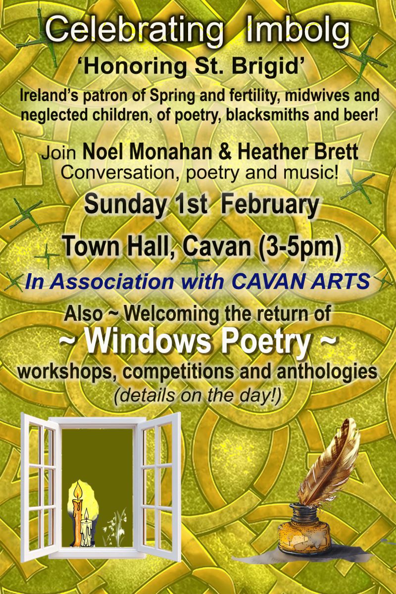 An invitation to celebrate Imbolg and honour St. Brigid with poets Noel Monahan and Heather Brett on Sunday 1st February at Town Hall, Cavan from 3:00 p.m. to 5:00 p.m. for an afternoon of conversation, poetry and music. The event will share details of the welcome return of 'Windows Poetry', a series of workshops, competitions and anthologies.