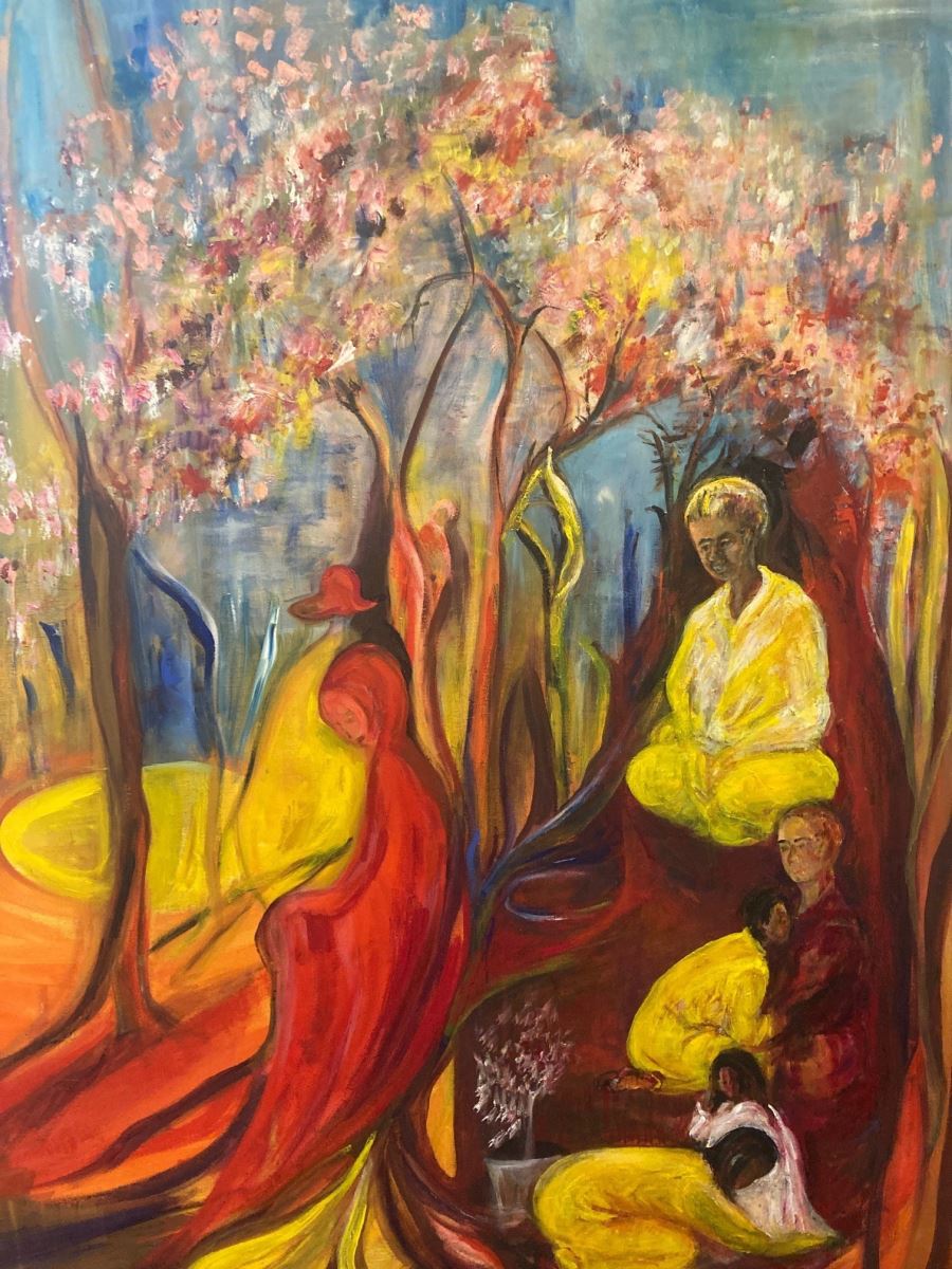 Her paintings explore the beauty of the world around her, as in the woods surrounding Lough Ramor. But simultaneously embrace that changing scape with a sense of what it is to be a Caribbean woman in rural Ireland.
